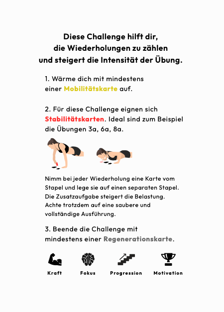Nutze das Deck als Zählhilfe, Challenge und um gemeinsam mit Freunden oder im Team zu trainieren.